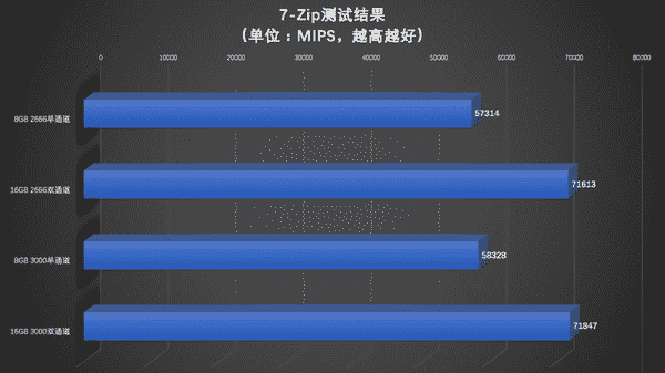 通過7-Zip以及其他理論性能測試軟件可以看出,內存頻率提升對成績影響并不明顯,但在某些應用中采用內存雙通道后,總體評分有了約25%的提升。