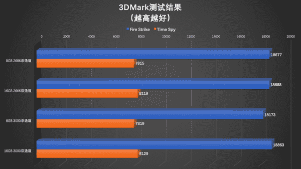 同樣,通過3DMark測試可以看到內存頻率提升對于測試成績的影響微乎其微,但是采用雙通道后,TimeSpy測試相比單通道上升了約4%。