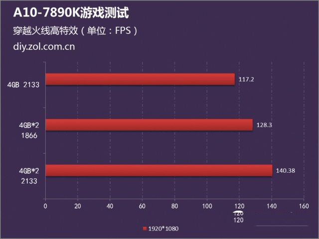 A10-7890K在4GB 2133下平均117.2幀,在4GB*2 1866下平均128.3幀,在4GB*2 2133下平均140.38幀。