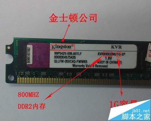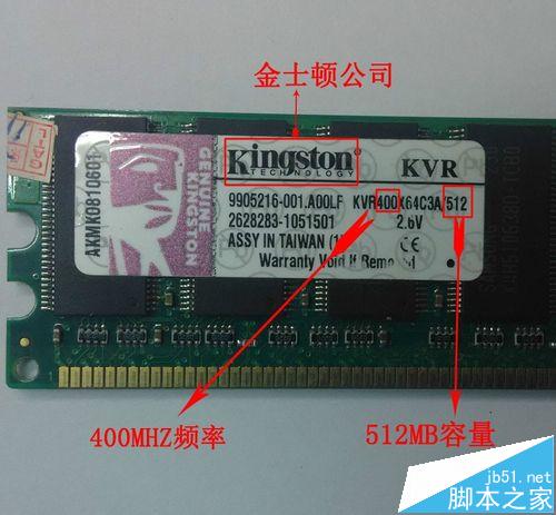 2、仔細看看內存條上的標簽,首先,這是一條金士頓牌子的內存條,頻率為400MHZ,容量只有512M,也就是0.5G。頻率才是關鍵。一代內存條的頻率有333MHZ和400MHZ,所以標簽上的“400”就足以證明它是一代內存條。容量不是關鍵,一代內存條有1G容量的,三代內存條也有1G容量的。