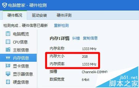 9、當然,正在使用的電腦,想要知道內存條的類型,不需要把內存條拔出來。只需借助一些硬件檢測軟件,可以很方便地查看內存條的容量,頻率。瞧瞧我用“騰訊電腦管家”的“硬件檢測”工具檢測出來的內存信息。可以看出,我的內存條是三代2G的內存條。