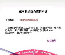 如防偽數碼被再次查詢,則答復為“您查詢的號碼已在XXXX年XX月XX日XX時XX分查詢過,該號碼已失效,請您謹防假冒。”