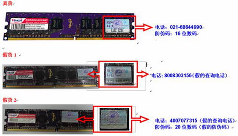 其實分辨真偽威剛內存十分簡單。拿到一款威剛內存產品首先通過肉眼觀察,從內存貼紙上的防偽電話到外包裝的設計,真假產品都能看出不同。首先從防偽標識和防偽電話說起,威剛“萬紫千紅”系列內存整個PCB板以紫色為主,電路板中間有V—DATA的燙金標志,內存顆粒上貼有V—DATA的紅色條碼貼紙和威剛科技的防偽貼紙,防偽貼紙上標明了查詢電話和網站地址以及可刮開圖層的防偽碼。威剛“紅色威龍”在綠色PCB板層外加裝了紅色的散熱片,散熱片正面貼有激光條碼貼紙,背面則是防偽貼紙。如果從外觀上無法區分真假,那么防偽貼紙上查詢電話和可刮開的防偽碼則能幫您徹底的弄清產品的真偽。