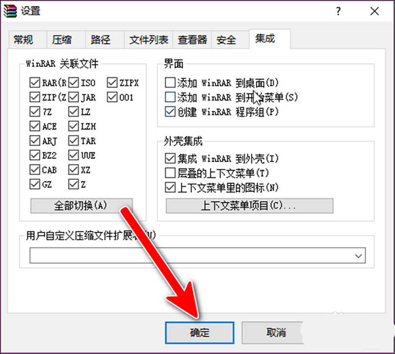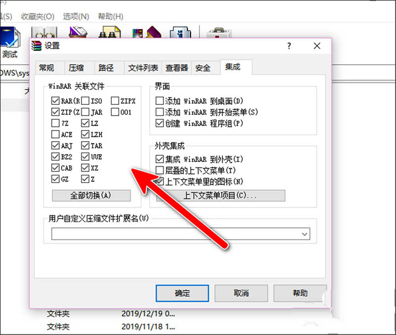 5、然后再“集成”設置欄里,就能找到“WinRAR關聯文件”,勾選要關聯的類型,或者去掉√取消關聯。