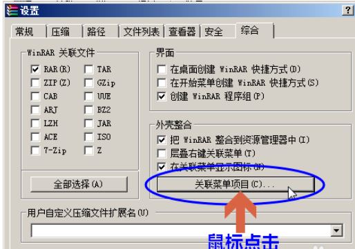 若是鼠標(biāo)右鍵菜單中的WinRAR項目還有問題,就要再點擊同在綜合選項卡的“關(guān)聯(lián)菜單項目”按鈕。該選項可以設(shè)置鼠標(biāo)右鍵菜單中的WinRAR相關(guān)項目。