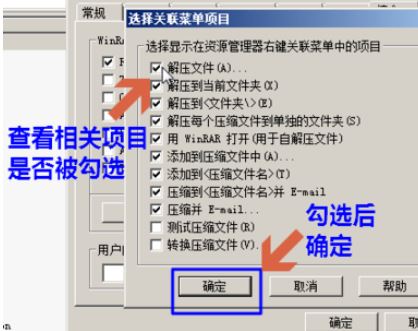 接下來我們在“關(guān)聯(lián)菜單項目”中查看你需要的項目是否被勾選,如果沒勾選,就勾選你需要在鼠標(biāo)右鍵菜單中顯示的項目,再點擊“確定”,則鼠標(biāo)右鍵中的WinRAR項目就恢復(fù)了。