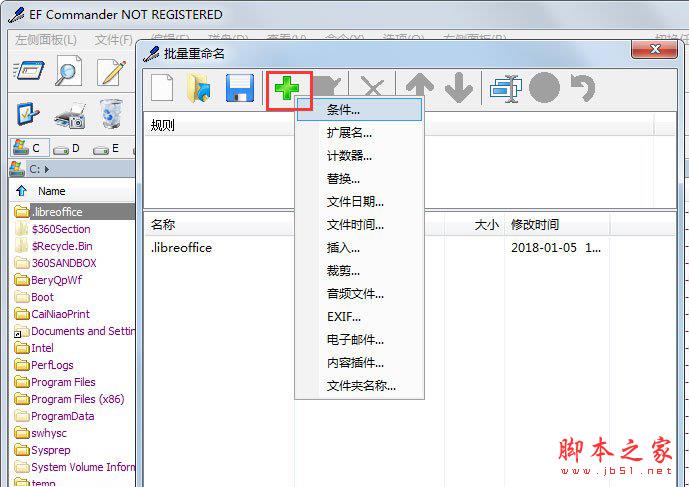 4、隨即進入批量重命名窗口,點擊“+”按鈕添加新規則,其能夠支持條件/擴展名/計數器/替換等多種方式;