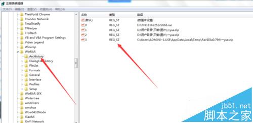 6、在彈出的注冊表編輯器中,打開HKEY_CURRENT_USER/Software/WinRAR/ArcHistory分支。