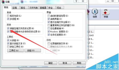 4、在彈出的設置對話框中點擊“常規”選項卡,把歷史下面兩個勾選的去掉,默認是打鉤的。去掉勾選后單機確定即可。以后winrar都不會保留使用文件記錄了。