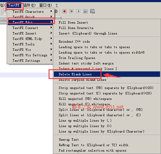 先下載安裝插件 TextFX,下載后重新啟動(dòng)下,然后在菜單欄找到 TextFX -> TextFX Edit -> Delete blank lines,即可。