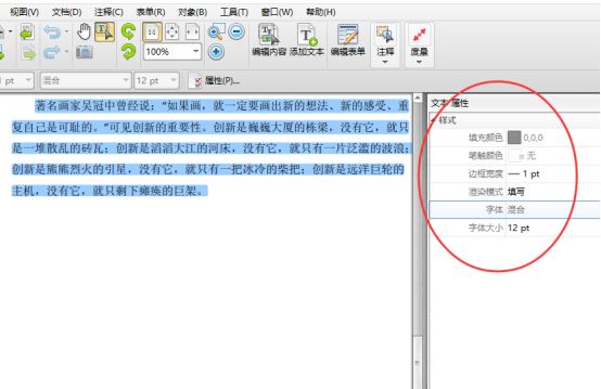 4、PDF文件中的內容選中后,我們可以看到其文本屬性,這些都是可以進行編輯修改的,我們還可以根據頂部的功能任務欄進行操作。