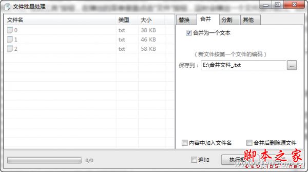 文本文件的合并和分割,是非常常見的一項(xiàng)操作。但是這樣簡單的操作,除了進(jìn)行手工操作外,就是需要借助于專業(yè)工具進(jìn)行操作。不過現(xiàn)在使用虹吸墨的“文件批量處理”中的其他命令,即可快速實(shí)現(xiàn)這一任務(wù)。首先通過鼠標(biāo)將需要進(jìn)行合并的文件,拖拽到“文件批量處理”窗口里面。接著在文件列表中選中一個文件,通過右鍵菜單中的“向上移”或“向下移”命令來調(diào)整文件的順序。然后點(diǎn)擊右側(cè)窗口中的“合并”標(biāo)簽,在窗口里面選中“合并為一個文本”項(xiàng)。最后設(shè)置合并以后的文件保存目錄并點(diǎn)擊“執(zhí)行操作”按鈕,就可以進(jìn)行這些文件的合并操作了(圖6)。除此以外,通過“分割”標(biāo)簽中的選項(xiàng),還可以按行、按大小、按份數(shù)的分割方式進(jìn)行文本文件的分割操作。