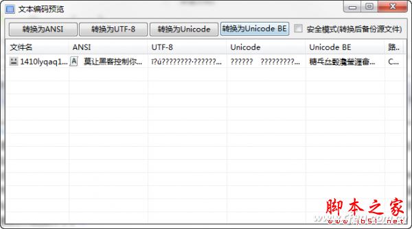 這次在虹吸墨的“擴(kuò)展功能庫”窗口中,找到左側(cè)列表中的“文本編碼預(yù)覽”項(xiàng),打開它以后就會顯示出“文本編碼預(yù)覽”窗口。接著選中要進(jìn)行編碼轉(zhuǎn)換的文件,將其拖拽到該窗口上方進(jìn)行釋放。稍等片刻會在窗口列表中顯示出,每個文件分別用ANSI、UTF-8、Unicode、Unicode BE編碼的顯示結(jié)果。而我們只需要通過是否為亂碼,就可以判斷出該文件真正的編碼。如圖7中只有ANSI顯示的不是亂碼,就說明這個文件是用ANSI編碼完成的,所以只要點(diǎn)擊“轉(zhuǎn)換為ANSI”按鈕就可以進(jìn)行編碼的轉(zhuǎn)換(圖7)。不過為了穩(wěn)妥起見,建議選中右上角的“安全模式”選項(xiàng)。