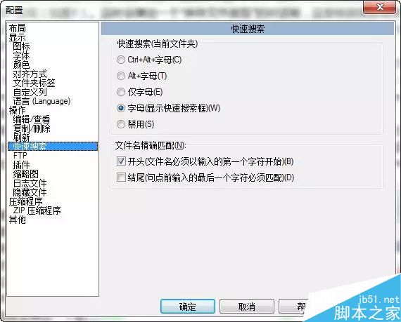 如果不想使用快捷鍵而直接進行搜索,需要先打開TC的選項窗口。選擇左側列表中的“快速搜索”這項,接下來在右側窗口里面選中“字母(顯示快速搜索框)”選項即可。