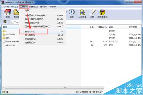 4、壓縮軟件打開電子書后,依次點擊“工具”>“查找文件”。