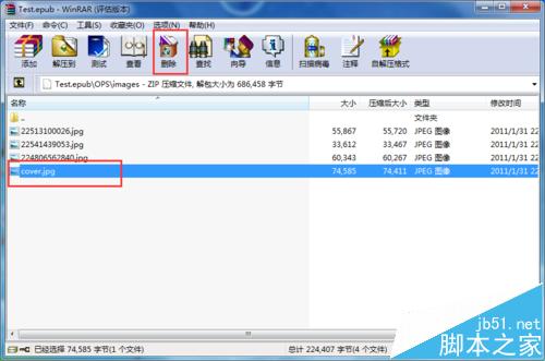 7、選中“cover.jpg”文件,然后點擊“刪除”選項。