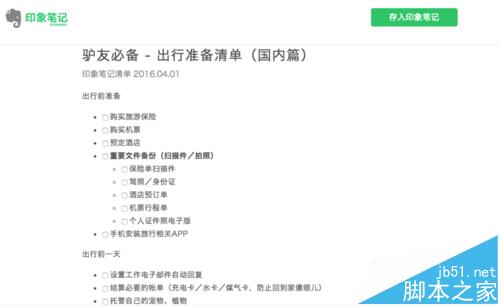 1、百度搜索『印象筆記模板』,點擊第一個鏈接,然后點擊博文中的『模板大全』鏈接。打開自己感興趣的模板,比如點開清單 -> 驢友必備 - 出行準備清單(國內)