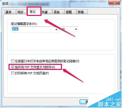 2、修改筆記選項.在【選項窗口】,依次選擇[筆記]。在[筆記]中,您會看到[始終將PDF文件顯示為附件],就是它了,您只需在這句話前面打勾即可。