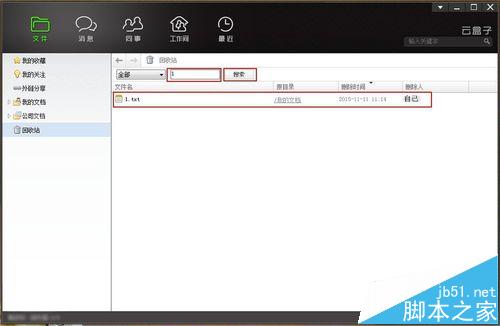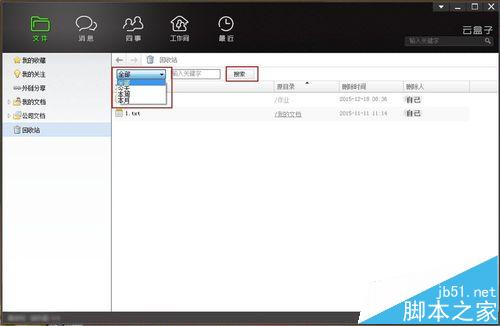 2、我們可以通過文件列表上面的搜索按鈕進行檢索,可選擇刪除時間以及文件名關鍵字進行檢索(這里的文件只要不去徹底刪除會永久保存)。
