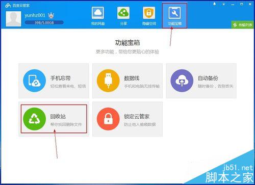 1、打開百度云管家,點擊功能寶箱,點擊回收站,會彈出百度云的網頁。