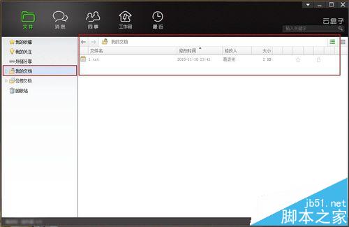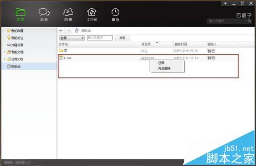 1、打開云盒子客戶端,在左側選擇回收站,右側則會直接顯示曾經刪除過的文件(非管理員只能看到曾經在我的文檔里的文件)。