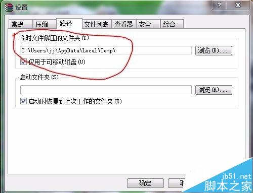 5、修改臨時文件解壓的文件夾路徑,可以點擊右側的瀏覽自定義要存放臨時文件的地方,然后去掉"僅用于可移動磁盤",完畢后點擊確定保存設置。