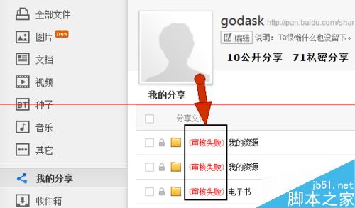 3、在這里你可以查看自己的分享是否通過了百度的審核。也就是說生成分享鏈接并不意味著分享成功,只有通過審核才行。如果顯示“審核失敗”,即使你的鏈接發給了朋友,他自然無法訪問。
