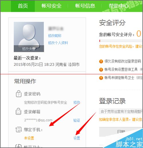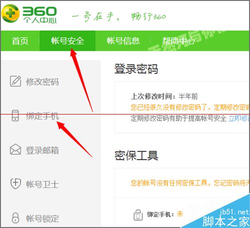 6、在它首頁的后面,我們點擊一下賬號安全。可以看到它上面有個密保工具,我們可以在它這里進行一個手機的綁定。當然也可以在這個頁面中直接點擊綁定手機。