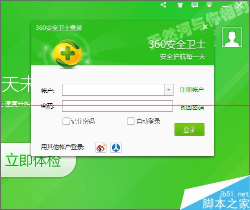 2、這時候在這出現的小面板中點擊登陸,輸入我們的自己的360賬號。(如果沒有賬號的話,點擊它旁邊的注冊賬戶,然后輸入自己的郵箱注冊一個。)