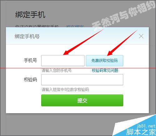 9、點擊了提交,在它彈出的面板中我們輸入自己的手機號,輸入點擊免費獲取校驗碼。稍等一會就會有一條短信發送到您的手機上,您只要在校驗碼的那一欄輸入短信中的校驗碼,然后點擊提交。