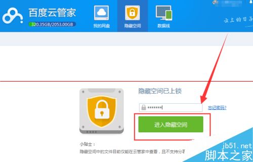 7、再回到【百度云管家隱藏空間】界面,輸入剛才設置的新密碼,再單擊【進入隱藏空間】,就可以成功打開隱藏空間了。如下圖所示。