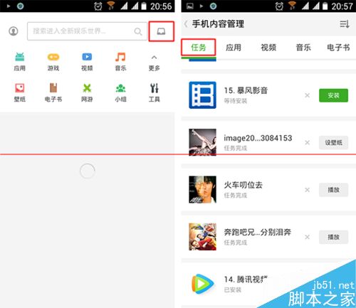1、要查看豌豆莢手機版、下載中、和已下載的文件非常簡單。只需在主界面的右上角點擊一下【 圖標】然后在內容管理這里在點擊【 任務 】就可以看到下載的內容了。
