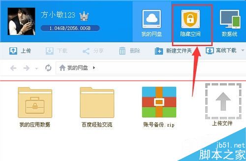 3、然后來到百度云管家首頁,在頂部主菜單中點(diǎn)擊“隱藏空間”。(如下圖)