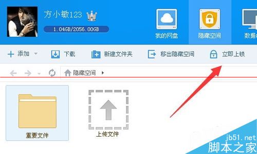 6、開啟隱藏空間之后,再點(diǎn)擊中間的“上傳文件”按鈕。(如下圖)