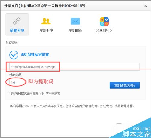 8、復制成功后,我們就能將此鏈接發至論壇、貼吧、博客等,而當有私密好友來想你索要提取碼的時候,你就可以將此提取碼給他。