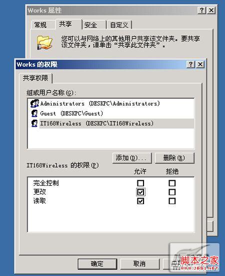 即便是超級用戶,也可以設置其權限。例如,我們共享“學習資料”這個文件夾,設置為Guest用戶可以讀取,設置IT168Wireless用戶可以更改和讀取,而超級用戶Administrator設置為完全控制。首先刪除everyone用戶組,再一一設置每個用戶的具體權限。