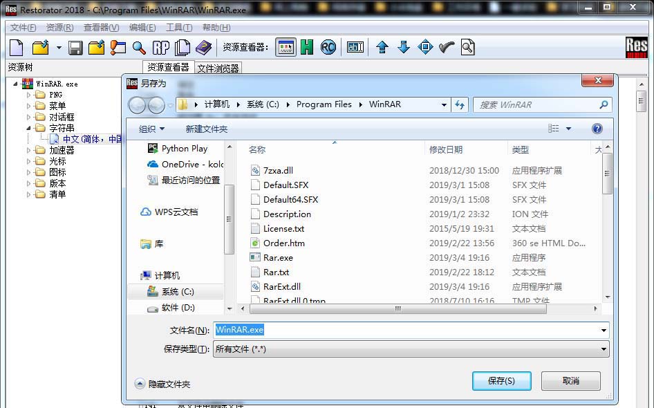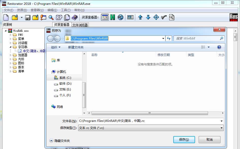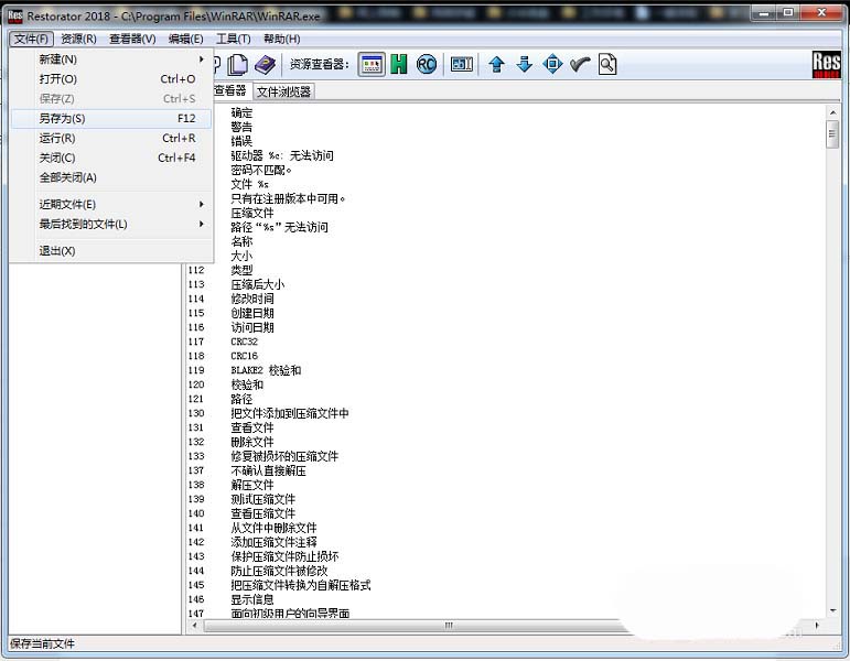 PS:后續(xù)如有升級(jí),可以用Restorator 2018打開“WinRAR.exe”,在資源樹列表中鼠標(biāo)左鍵單擊“字符串”下的“中文(簡體,中國)”文件,鼠標(biāo)右擊選擇導(dǎo)入,導(dǎo)入前期保存好的“中文(簡體,中國)”文件。