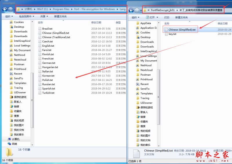 1、本軟件操作界面本身為英文操作,將軟件解壓包的補(bǔ)丁包里的"Chinese(Simplified).txt"復(fù)制粘貼至軟件安裝目錄里(默認(rèn)位置C/Progaram Files/Fort - File encryption for Windows/Lang)