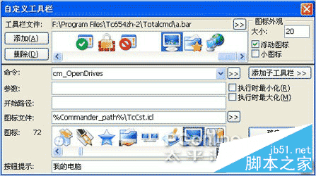 啟動TC,在工具欄的空白處單擊右鍵并在彈出菜單上選擇“更改”打開“自定義工具欄”對話框,如圖2所示,在“命令”中輸入打開“我的電腦”的TC命令代碼,接下來為“我的電腦”選擇一個(gè)工具欄圖標(biāo),然后在“按鈕提示”中輸入“我的電腦”,最后單擊“確定”。