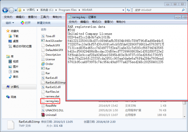 2.下載安裝好后,用記事本打開rarreg.key,網上去找一個注冊文本復制到winrar安裝目錄下的rarreg.key里面保存即可。
