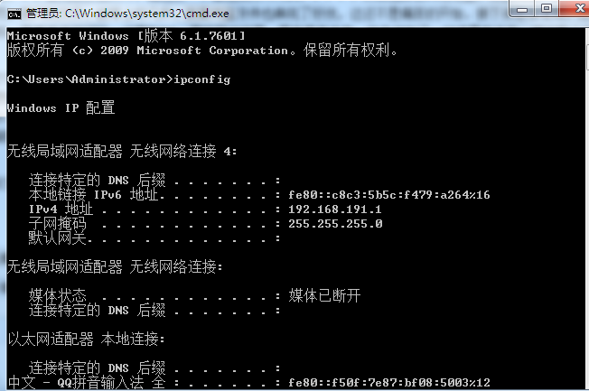然后呢,用電腦搭建一個服務器,手機就是未來的客戶端,訪問此服務器上的內容。電腦上裝了appach的可以直接開啟一下,這時候看一下電腦所在的局域網ip,等下手機訪問使用。 操作方法如下win+r ,輸入cmd確定輸入ipconfig 接下來就出現好幾個ip地址,主要看無線局域網的那個,可以看到這里博主的是192.168.191.1,