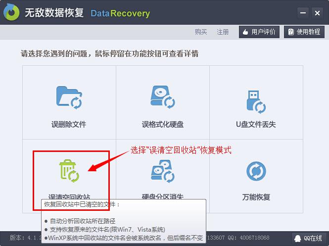 步驟3、打開無敵數(shù)據(jù)恢復(fù)軟件,用戶將可以看到整個(gè)軟件的基本界面。選擇“誤清空回收站”選項(xiàng)進(jìn)入到下一步。