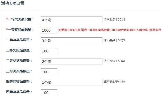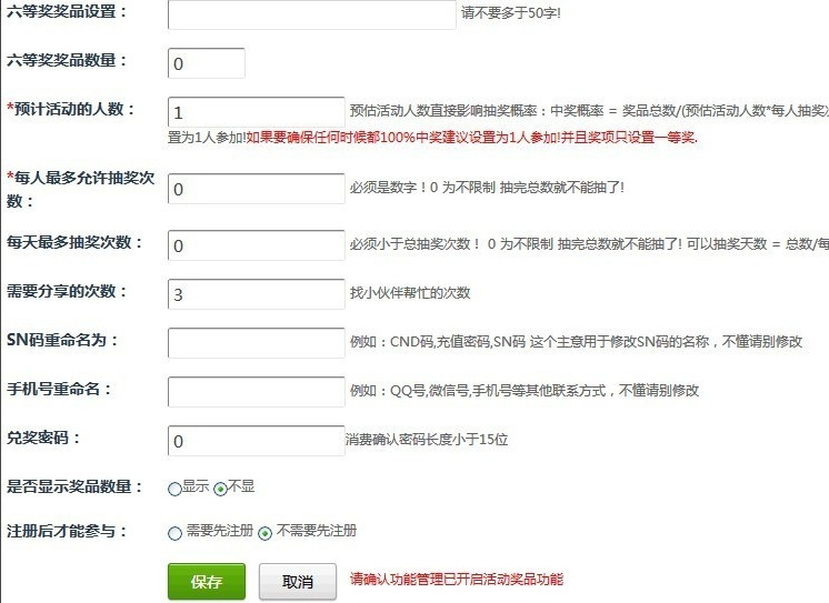 5、填寫獎項設置,注意紅色的提示語,SN碼,手機號等不懂可以空著不填。