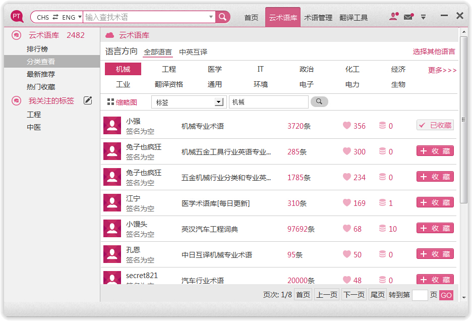 點擊熱門標簽將顯示包含該標簽的所有共享術語庫。點“更多”可查看更多標簽。