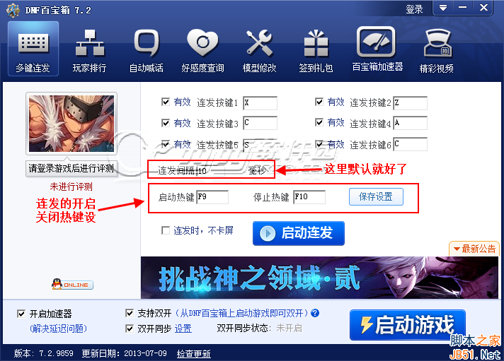 安裝完畢后打開DNF百寶箱,默認的主界面可以對連發進行設置,一共可以設置六個鍵,一般我們也沒必要那么多鍵都設置成連發,在需要設置的鍵位前面打鉤就可以了。