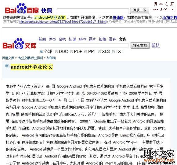 如搜索android+論文,輸入:site:wenku.baidu.com android+論文 (中間有空格)