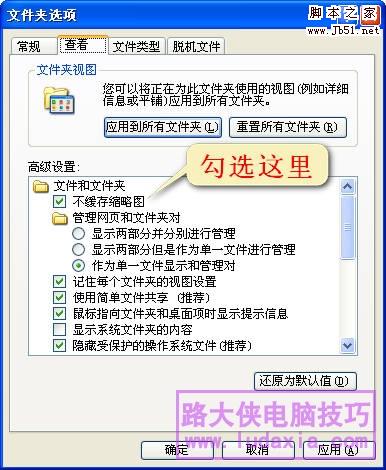隨便打開一個(gè)文件夾,點(diǎn)擊菜單欄上的“工具”,選擇“文件夾選項(xiàng)”。切換到“查看”選項(xiàng)卡,勾選“不緩存縮略圖”。如下圖:
