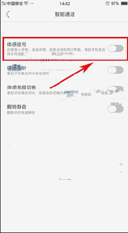 2)最后將【體感撥號】那欄右邊的橢圓往右拉打開即可,(如下圖)OPPO A59s怎么開啟體感撥號教程
