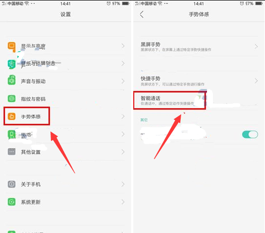 1)首先我們先打開【設置】,然后再找到【手勢體感】,打開后我們再點擊【智能通話】。(如下圖)OPPO A59s怎么開啟體感撥號教程