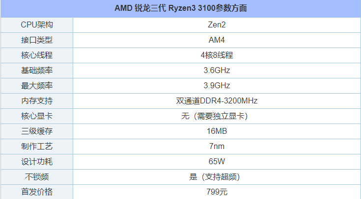 先睹為快,我們先來看下AMD銳龍Ryzen3 3100處理器的參數方面,如下表格。